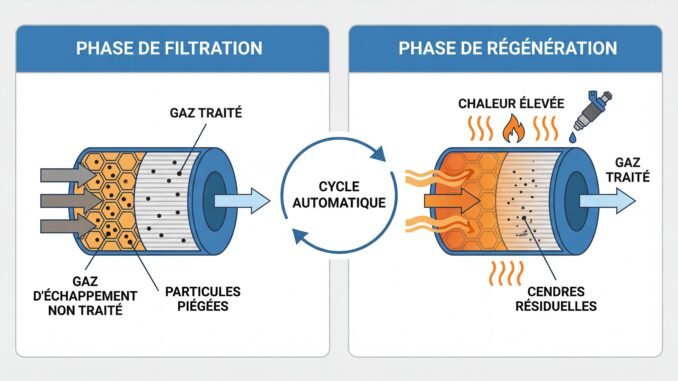 Le FAP fonctionne en deux cycles : la filtration et la régénération. Pendant la filtration, les particules en suspension sont piégées dans une structure en céramique en nid d’abeilles. Mais pour éviter l’obstruction totale, le système doit régulièrement brûler ces suies accumulées à haute température (environ 550-600°C) lors d’un processus appelé régénération.