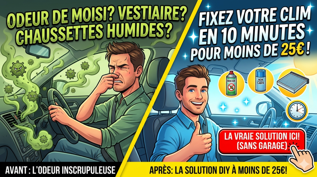 Vous remettez la climatisation en route après quelques semaines sans l’utiliser, et une odeur de climatisation moisi, de vestiaire ou de chaussette humide envahit l’habitacle. C’est désagréable, c’est récurrent, et la plupart des conducteurs ne savent pas vraiment pourquoi ça arrive — ni comment y remédier correctement. Ce guide vous explique la cause précise du problème, les solutions qui fonctionnent vraiment, et celles qui ne servent à rien.